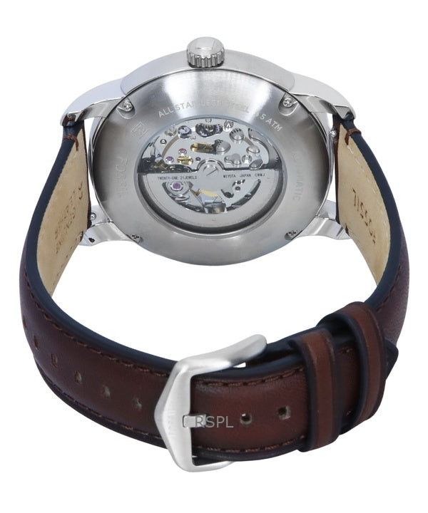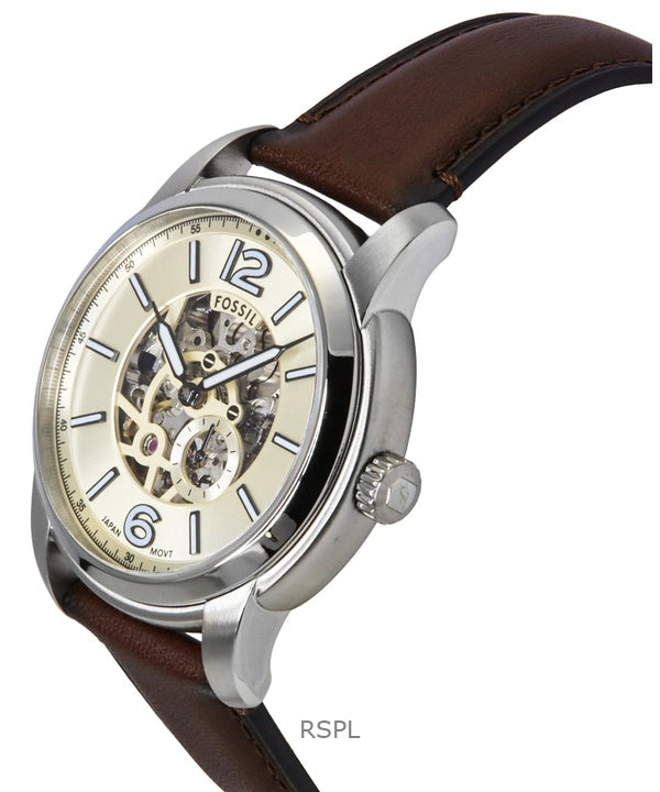 Fossil Heritage brunt läderarmband krämfärgad skeletturtavla automatisk ME3264 herrklocka