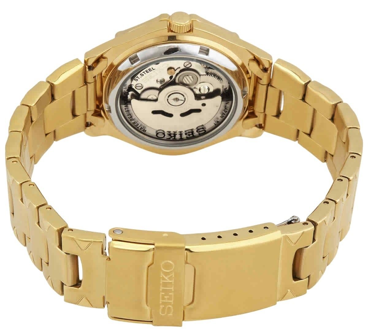 Renoverad Seiko 5 Sports guldfärgad rostfritt stål guld urtavla automatisk SNZ450J1 100M herrklocka
