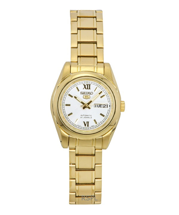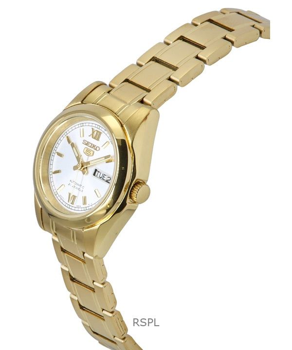 Seiko 5 guldfärgad rostfritt stål vit urtavla automatisk SYMK30K1 30M damklocka